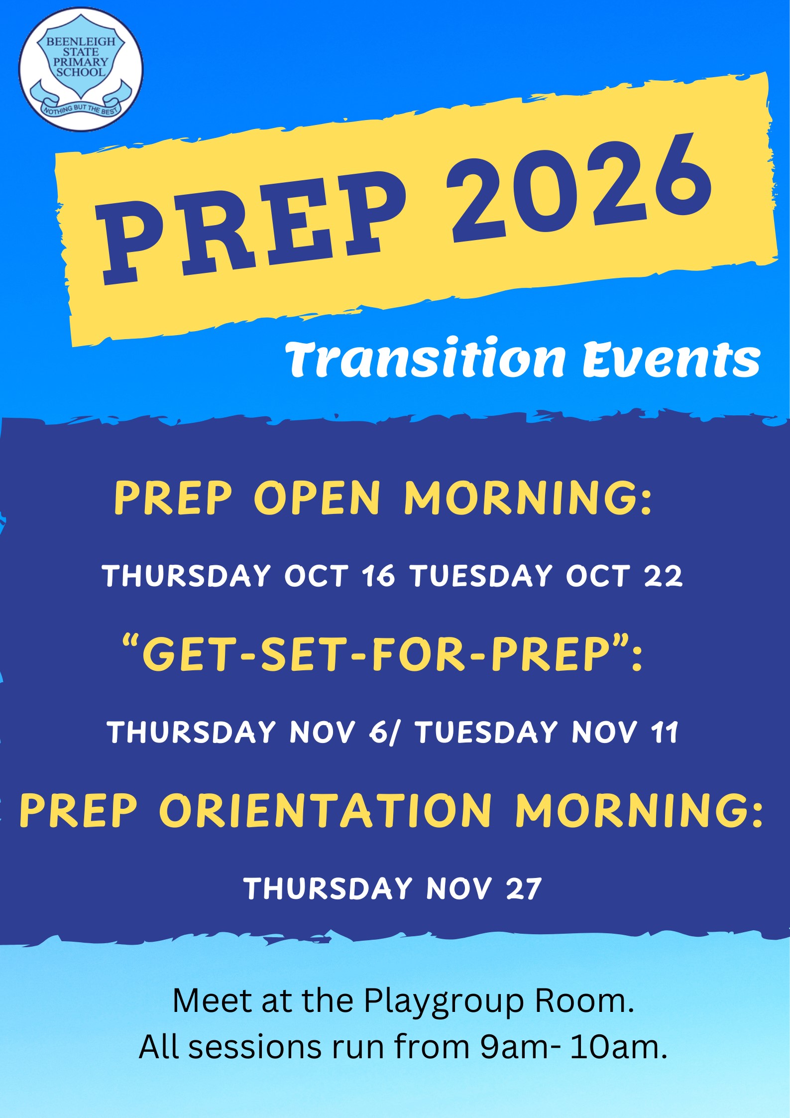 Call (07) 3386 2333 or email admin@beenleighss.eq.edu.au to arrange a prep enrolment pack and to book an enrolment interview with the principal.Don't miss out on our Transition to Prep program which will be running in term 4.